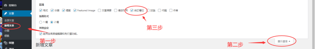 打开后台-文章-新增文章-(右上角)显示选项-勾选(自定栏位|自定义栏位)