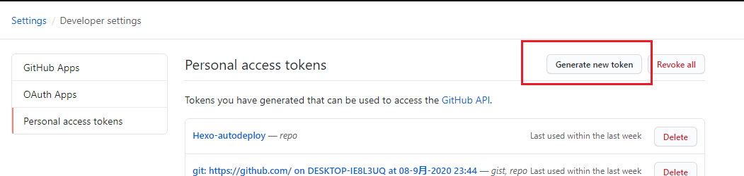 访问 Github-> 头像(右上角)->Settings->Developer Settings->Personal access tokens->generate new token, 创建的 Token 名称随意,但必须勾选 repo 项。