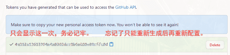 - token 只会显示这一次,之后将无法查看,所以务必保证你已经记录下了 Token。之后如果忘记了就只能重新生成重新配置了。